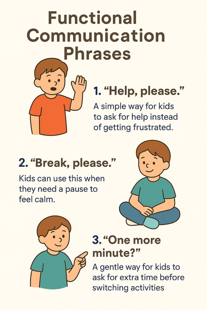 FCT ABA is most effective when families understand how it applies to everyday situations. The following real-world examples demonstrate how challenging behaviors can be replaced with simple and effective communication skills that meet the same need.