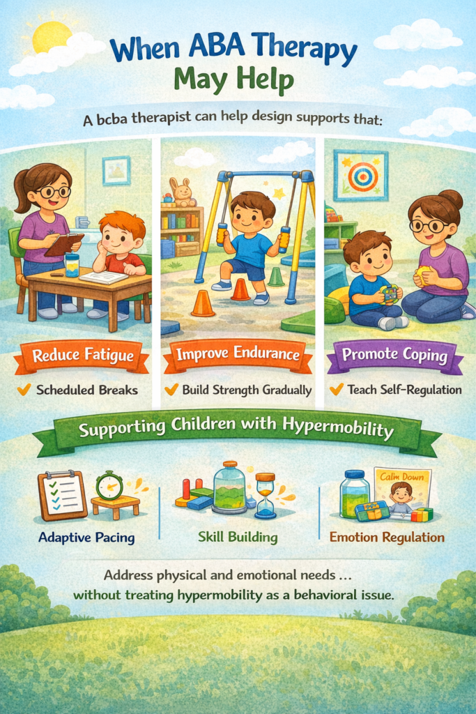 For some families, the support that ABA therapy provides can help their children develop the necessary coping strategies, adjust activity demands, and develop routines that lower their stress level without treating their hypermobility as a behavioral concern.