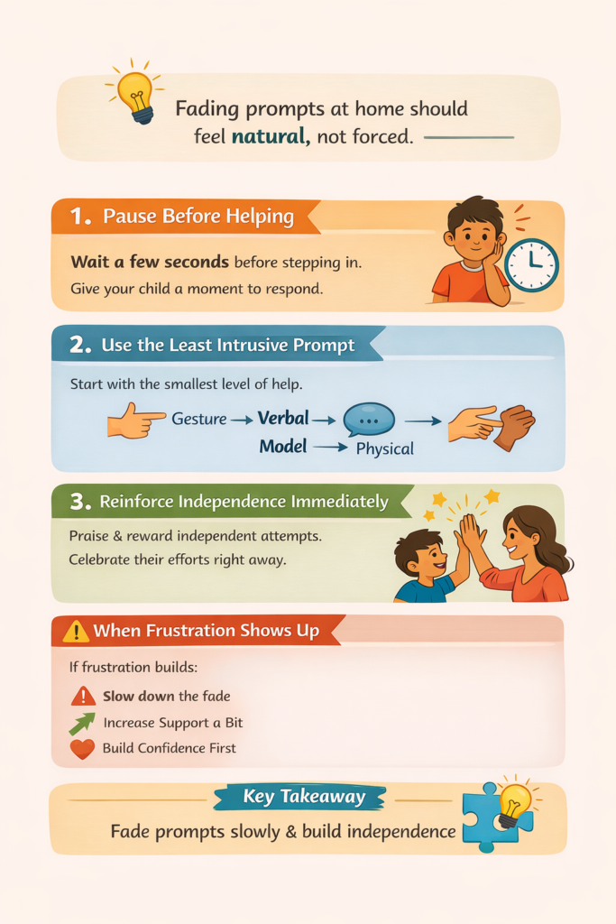 Moving from full physical guidance to partial physical, then to a gesture, and finally to an independent response. The key is to fade prompts slowly enough that the child continues to succeed, but quickly enough to avoid dependency.